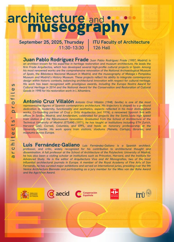 Within the framework of a collaboration between the Faculty of Architecture at Istanbul Technical University (ITU) and the Embassy of Spain in Turkey (Embajada de España en Turquía), the seminar entitled “Architecture and Museography” will focus on the interdisciplinary intersection of architecture and museography.